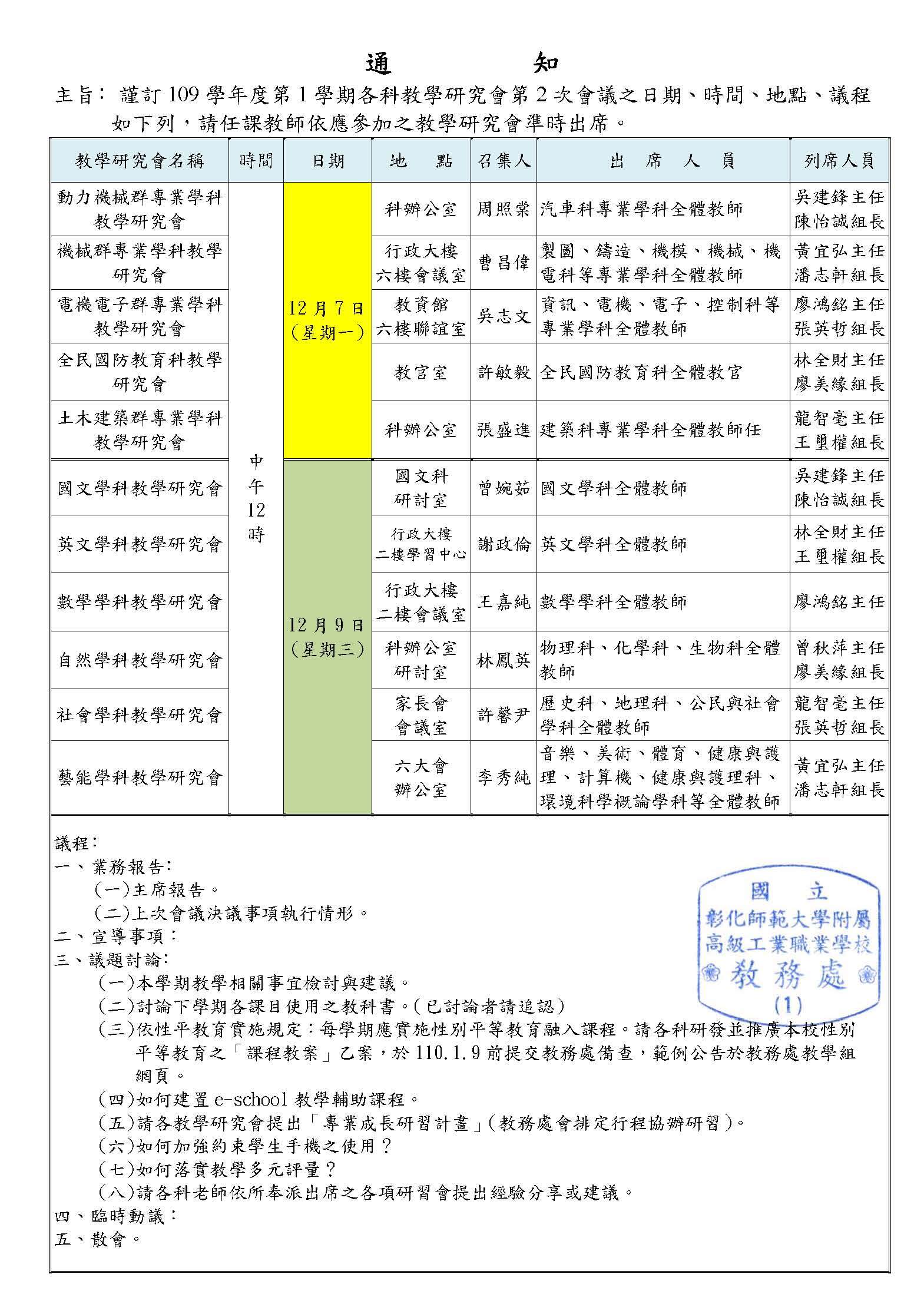 109學年度第二次教學研究會會議時間及議程,請教師依時間至會議地點開會。