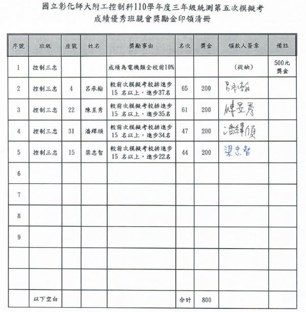 【獎勵金】控制科班親會頒發110學年度第五次模擬考獎勵金