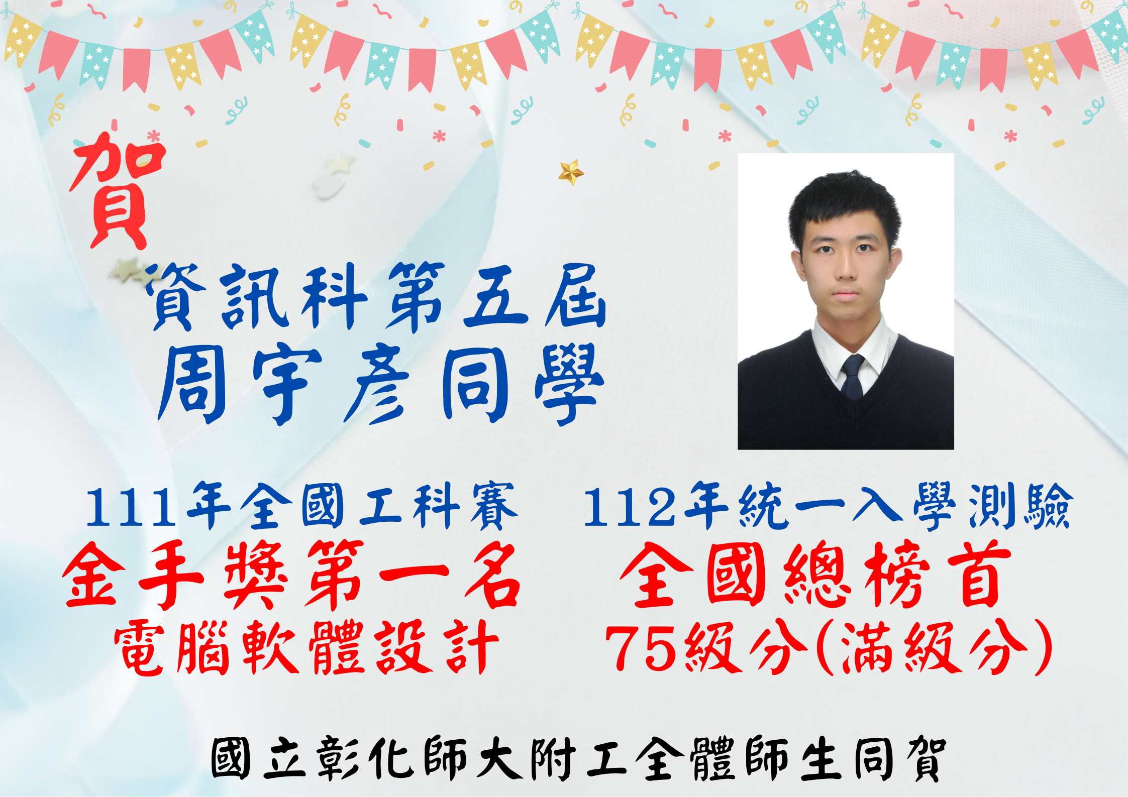 【恭賀!!】本校資訊科第5屆周宇彥同學,榮登112年統一入學測驗資電類【全國榜首】,各類群【全國總榜首】。