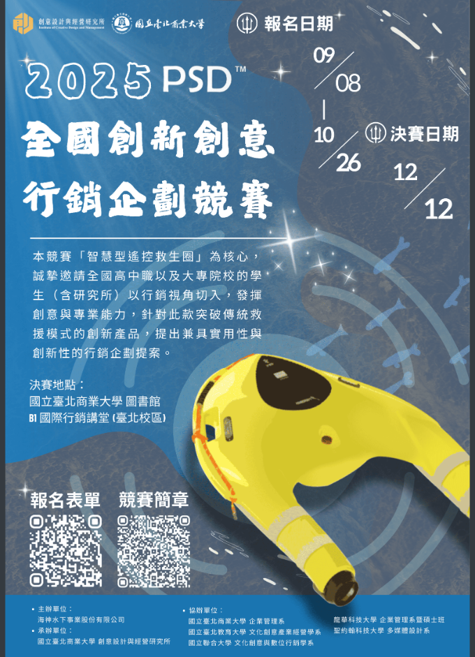 國立臺北商業大學創意設計與經營研究所承辦海神水下事業股份有限公司之「2025 PSD全國創新創意行銷企劃競賽」活動辦法更新
