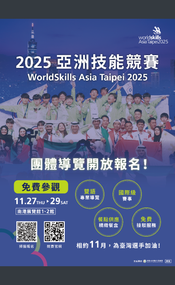 說明: 一、我國時隔32年,再度主辦國際級重要技能賽事,訂於114年11月27日(星期四)至11月29日(星期六)假臺北市南港展覽館1、2館(臺北市南港區經貿二路1、2 號)辦理。預定舉辦青年組、青少年組及表演賽共44個職類的技能競賽,橫跨製造、建築、資訊、設計及服務等多元產業領域,將吸引亞洲技能組織17個會員國與9個非會員國代表團來臺,總計超過千人共襄盛舉。本次競賽參與國家數、選手數皆是亞洲賽開辦以來之最,不僅象徵我國技能發展水準獲國際高度肯定,亦是我國向世界展現技能實力的重要契機。 二、除了各項競賽以外,本次活動更規劃「主題展示區-FORMOSA科技之島」,聯合產官學界展示臺灣AI科技與產業鏈結的應用實力,各樓層並設有技能互動體驗區(Try aSkill),能親身體驗發掘技能樂趣,錯過可惜。為歡迎並感謝各級學校師生(含僑外生)踴躍參訪,安排學生戶外教學,師生一同蒞臨參觀,申請報名將免費限量提供: (一)競賽現場專業級團體導覽(含外語)服務(可客製化導覽路線)。 (二)接駁服務(含車資與餐盒):為協助偏遠地區或交通不便之學校師生,本次活動規劃提供接駁服務,因名額有限,採先申請先審核,敬請把握,以免向隅。 (三)亞洲賽活動限量宣導品。 (四)申請網址:https://reurl.cc/GnMo8x (五)如有任何問題,請洽本活動受託單位: 台北市電腦商業同業公會林小姐,電話:(02)25774249分機473,電子郵件:elain@mail.tca.org.tw。 三、旨揭活動資訊請洽以下宣傳平台,歡迎轉發及關注。 (一)技能競賽主題網:https://skillsweek.wdasec.gov.tw (二)亞洲賽專屬網站:https://worldskillsasiataipei2025.com (三)FaceBook:https://www.facebook.com/WDASEC (四)Instagram:https://www.instagram.com/worldskillstw/ 四、檢附旨揭賽事海報、EDM及團體預約導覽及交通接駁服務實施計畫各一份。 五、敬請貴校准予帶隊參訪教師公(差)假及協助課務派代事宜。 ![]() ![]() 瀏覽數