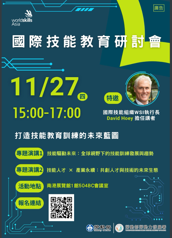 說明:一、依據勞發署114年10月9日發能字第1143602154號函辦理。 二、2025亞洲技能競賽訂於114年11月27日(星期四)至11月29日(星期六)假臺北南港展覽館舉辦。國際技能教育研討會係2025亞洲技能競賽之重要周邊活動之一,勞發署訂於於114年11月27日(星期四)15時至17時假南港展覽館1館504BC會議室辦理該研討會。 三、本次專題演講主題為「技能驅動未來:全球視野下的技訓練發展與趨勢」及「技能人才x產業永續:共創人才與技術的未來生態」,並邀請國際技能組織(WorldSkillsInternational, WSI)執行長David Hoey擔任講者之一,期藉交流分享產業創新、技能人才培育及教育發展之成功案例。 四、會議現場將提供同步口譯耳機,與會人員請攜帶個人證件以供領取;報名成功者將於11月寄送行前通知。 五、檢附研討會宣傳海報(含報名QR碼)1份。