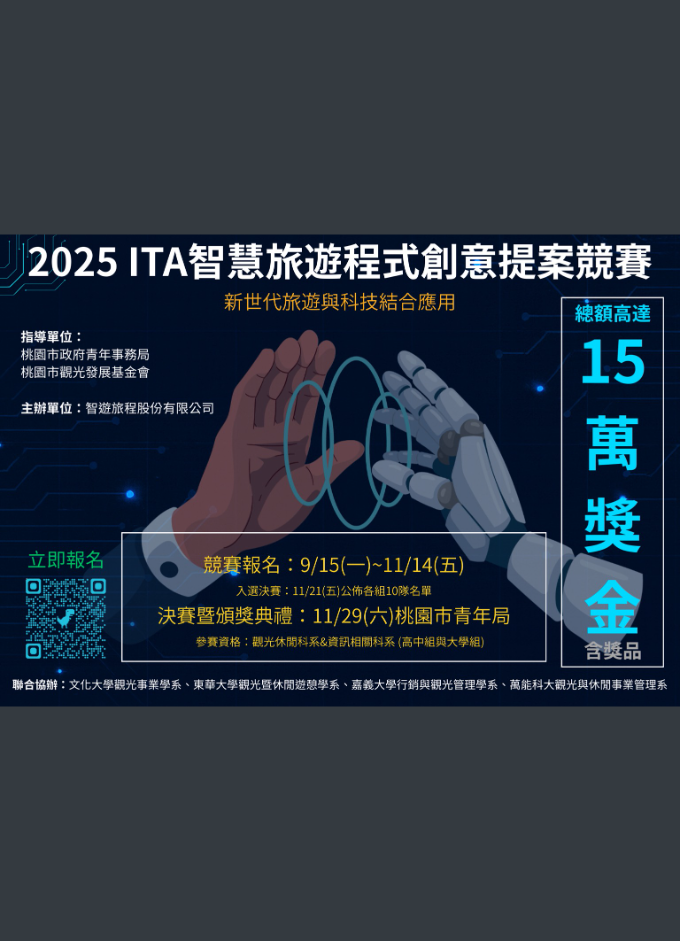 說明: 一、智遊旅程股份有限公司係本局所輔導之青年創業團隊,致力於協助觀光旅遊產業完成數位化轉型;為發掘新世代旅遊與科技結合之可能性,智遊旅程股份有限公司辦理「2025 ITA智慧旅遊程式創意提案競賽」,鼓勵全國青年學子共同發想提案。 二、前揭活動資訊,摘述如下: (一)報名期限:114年9月15日至114年11月14日止。 (二)參與對象:限觀光休閒及資訊相關科系之大專院校、高中職青年。 (三)活動網址:https://www.tourscombine.com/article/2025092629。 (四)報名方式:請進入活動網址後點選下方「立即報名」按鈕填寫線上表單。 (五)聯絡人:智遊旅程股份有限公司專案小組,電話:(03)2605886,E-mail:ita90560806@gmail.com。 三、為鼓勵我國青年學子運用創意帶動觀光旅遊產業之發展,請貴校惠予協助於官方網站、公佈欄或社群等張貼活動資訊。