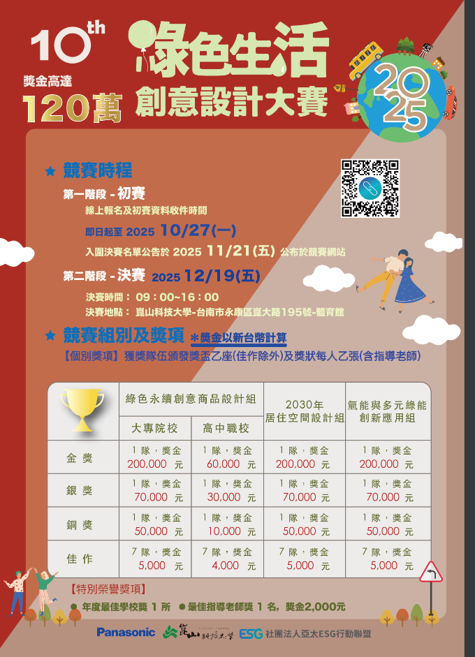 說明: 一、台灣Panasonic集團自2015年每年定期舉辦「綠色生活創意設計大賽」,本校延續前九屆綠色生活創意設計大賽精神舉辦「第十屆2025 綠色生活創意設計大賽」,讓創造美好生活的核心精神從校園、城市開始深化,激發學子們對「淨零碳排與智慧低碳生活、永續能源」,共同建立永續的未來。 二、辦理單位:主辦單位-台灣Panasonic集團;承辦單位-崑山科技大學;協辦單位-社團法人亞太ESG行動聯盟。 三、報名時間:延期至114年10月27日止受理報名。 四、報名方式:參賽隊伍必須先至「第十屆2025 綠色生活創意設計大賽」網站下載競賽簡章:https://greenlife.ksu.edu.tw/,如附件一所示。 五、競賽聯絡人:賴榮彬專案經理,電話:06-272-7175#540,電子信箱:panasonicksu@gmail.com