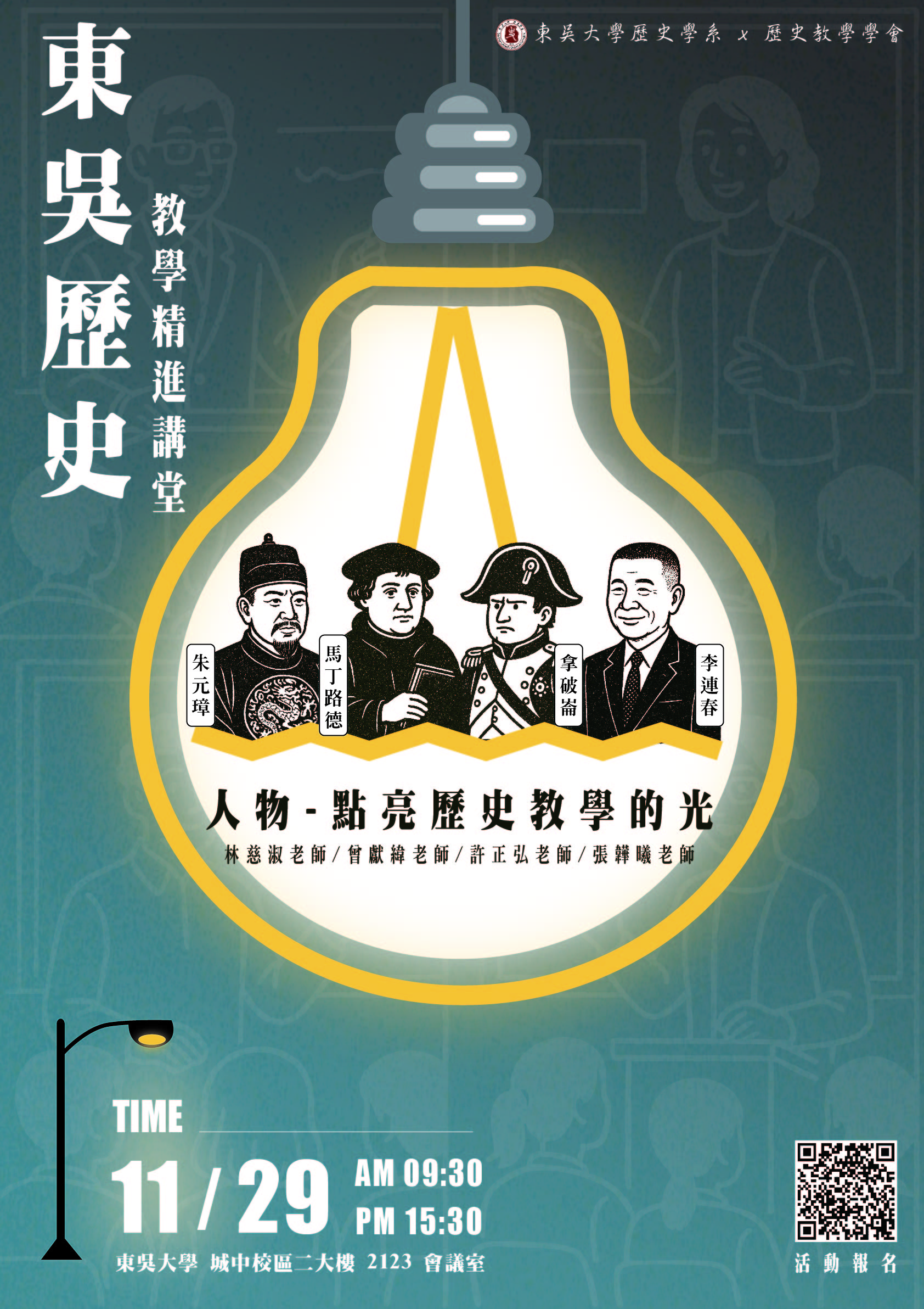 一、為因應歷史教學的新趨勢與新挑戰,本校歷史學系規劃辦理「東吳歷史教學精進講堂」活動,由本系專任教師以歷史人物為主題,分享研究成果、教學策略及反思,並透過 彼此的交流與討論,激盪出歷史教學與研究的新思維與新方法。 二、旨揭活動資訊如下: (一)時間:114年11月29日(六)10:00 ~ 15:30。 (二)地點:東吳大學城中校區二大樓2123會議室。 (三)人數及對象:60名,以中學歷史教師為主。 (四)講題: 1、馬丁路德的人生危機如何促發「宗教改革」? 2、機遇中的歷史行動者:拿破崙與其時代 3、朱元璋的「元朝底色」如何渲染出大明王朝? 4、一袋米換一袋肥料:李連春與戰後臺灣的糧食體制 (五)即日起至11月23日(日)23時59分止開放報名,額滿表單將自動關閉,不另行通知,網址:https://forms.gle/G5mHDtaANnNw1iRBA。 三、檢附活動海報乙份。