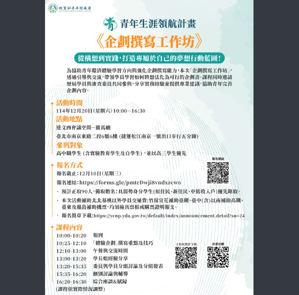 一、本署「115年度青年生涯領航計畫」已開放報名,青年須提交為期兩年的體驗學習企劃。為協助青年釐清學習方向與強化企劃撰寫能力,特辦理本次「企劃撰寫工作坊」,透過引導與交流,帶領學員學習如何將想法化為可行的企劃書。課程同時邀請歷屆學員與審查委員共同參與,分享實務經驗並提供專業建議,協助青年完善企劃內容。 二、工作坊資訊 (一)時間:114年12月20日(星期六)10:00-16:00。 (二)地點:達文西會議空間-羅馬廳(臺北市南京東路二段6號6樓)。 (三)對象:高中職(含實驗教育學生及自學生),並以高三學生優先。 (四)本次活動補助北北基桃以外的學生往返交通費,竹苗宜花補助臺鐵、臺中以南(含)補助高鐵、臺東及離島補助機票。 (五)報名:採網路報名(https://forms.gle/pmtcDwji8vndxzcw6),即日起至114年12月10日(星期三)止。