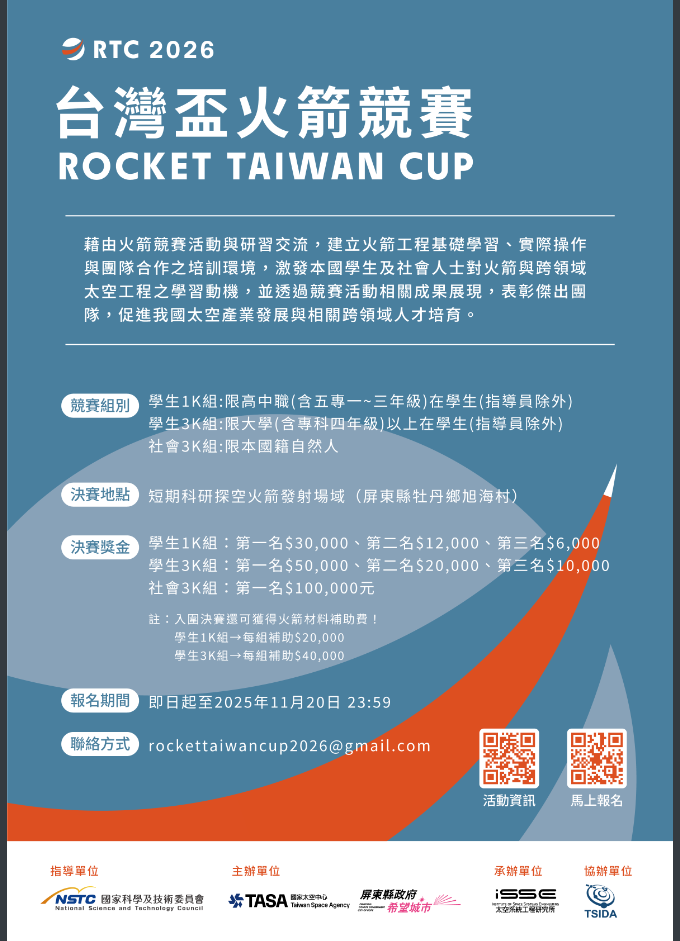 說明: 一、為推廣火箭並培育太空人才,國家太空中心將舉辦第二屆台灣盃火箭競賽,提供專業知能培訓及科研火箭發射實作機會,激發全民對太空探索的熱情,以提升太空意識。 二、「2026台灣盃火箭競賽」即日起受理報名,分為以下三組,每隊須指定指導員一至二人、隊長及副隊長各一人,隊伍總人數上限為15人。 (一)學生1K組:限高中職(含五專一至三年級)在學生。 (二)學生3K組:限大學(含專科四年級)以上在學生。 (三)社會3K組:限本國籍自然人。 三、為使有意參加者了解本活動,提供線上說明會影片:https://youtu.be/Qfx8KyAP5lA。 四、競賽活動辦法詳見本中心/2026台灣盃火箭競賽公告https://www.tasa.org.tw/zh-TW/events/detail/067a2757-bac3-4ec6-9dde-5d0eff1927e3 五、競賽活動諮詢請洽本中心太空教育辦公室羅小姐,電話(03)578-4208分機8937,Email:twcup_rocket@tasa.org.tw。