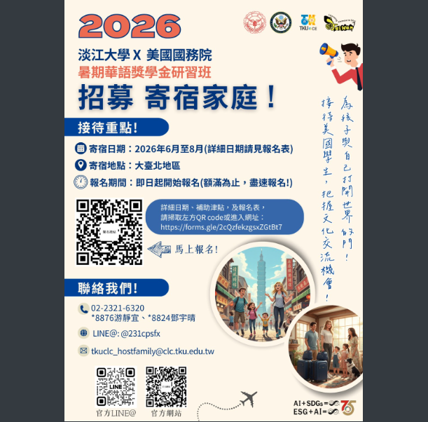 <公告>淡江大學推廣教育處華語中心承辦2026年暑期「美國國務院華語獎學金研習班」徵選臺灣寄宿家庭