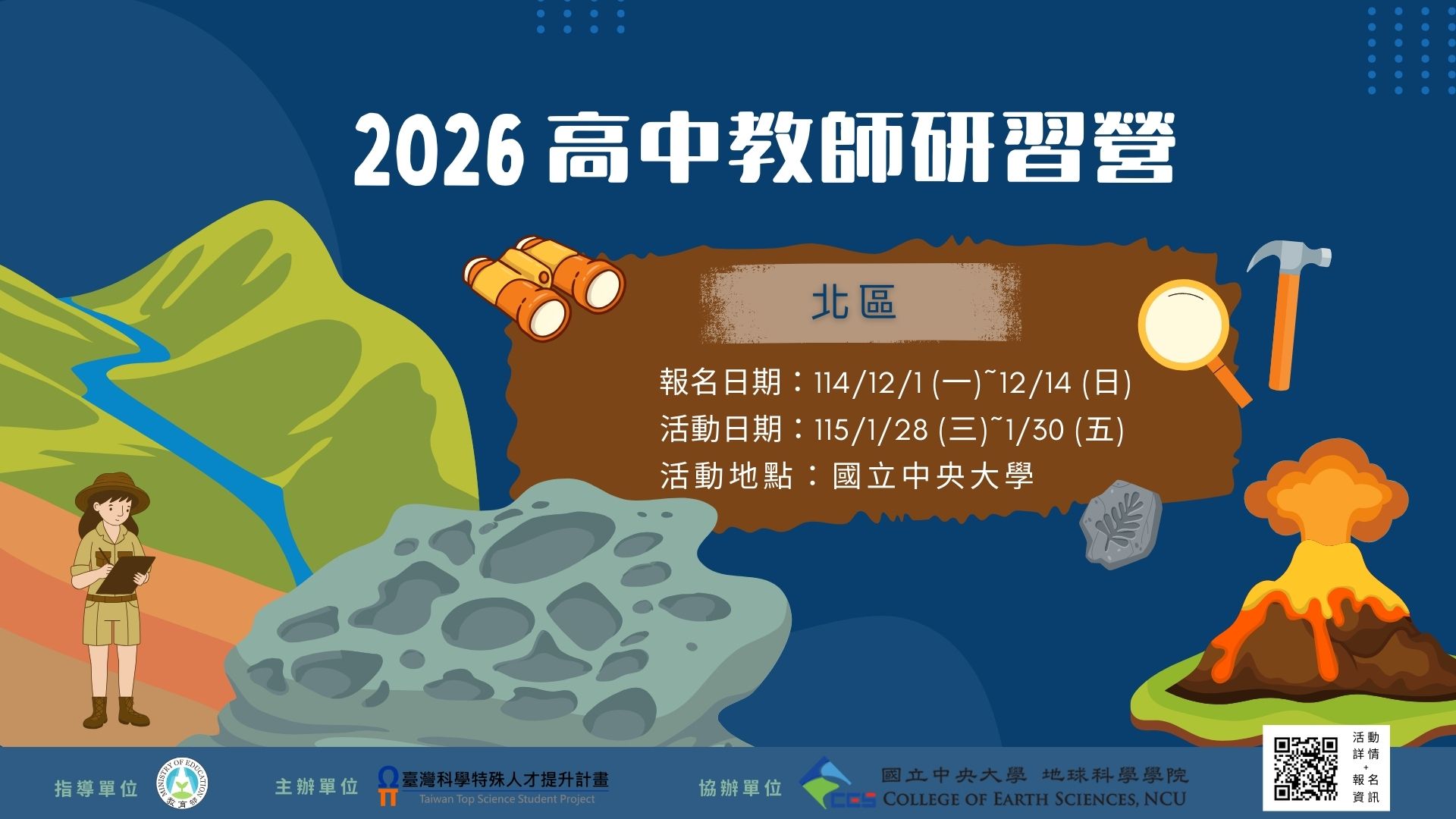 一、活動訊息如下: (一)活動時間:115年1月28日(二)至同年月30日(五)止。 (二)活動地點:國立中央大學。 (三)課程說明:本活動包含各領域課程,授課內容請參閱活動簡章及課程表(詳如附件)。 二、報名方式:114年12月1日(一)9時起至12月14日(日)前至下方連結填寫報名資料,逾期恕不受理。報 名 網 址 :https://ps1tw.astro.ncu.edu.tw/ttss/。 三、惠請協助於貴校網站公布活動訊息並轉傳電子海報、簡章,鼓勵教師踴躍報名。