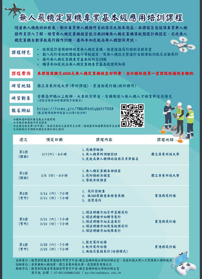 說明: 一、隨著無人機技術的發展,對於專業無人機操作員的需求也越來越高。本課程旨在提供專業無人機操作員深入了解、培育無人機定翼機組裝能力與訓練無人機定翼機導航圖設計與設定,完成無人機定翼機自動導航飛行操作訓練,進而參加民航局無人機證照考試。 二、課程資訊: (一)課程日期:115年3月7日、3月8日、3月14日、3月15日、3月21日、3月22日、3月28日、3月29日,共8堂課程。 (二)課程地點:國立屏東科技大學(學科課程)、里港西飛行場(術科操作)。 (三)課程人數:25~30人。 (四)課程對象:全國高中職以上教師、大專校院學生,有興趣投入無人機人才培育師生為優先(須能全程參加安排課程方能報名)。 (五)課程方式:實體授課。 (六)報名網址:https://forms.gle/7MQ4WAdGqQdAfVDX8 (報名時間為即日起至115年2月23日)。 (七)課程費用:本課程需繳交4000元無人機定翼機組裝材料工本費,於最後一堂課程將機體帶回。費用須於錄取後第一堂課程現場現金繳納。 (八)全程活動免費(含午餐),住宿與前往交通請學員自理。 (九)全程參與者於課程結束後授予研習證書。 三、活動聯絡人:教育部促進產學連結合作育才平臺-國立高雄科技大學執行辦公室 蕭于凱副理, 電話: 0 7 -6011000轉31492,電子郵件:karlhsiao@nkust.edu.tw。