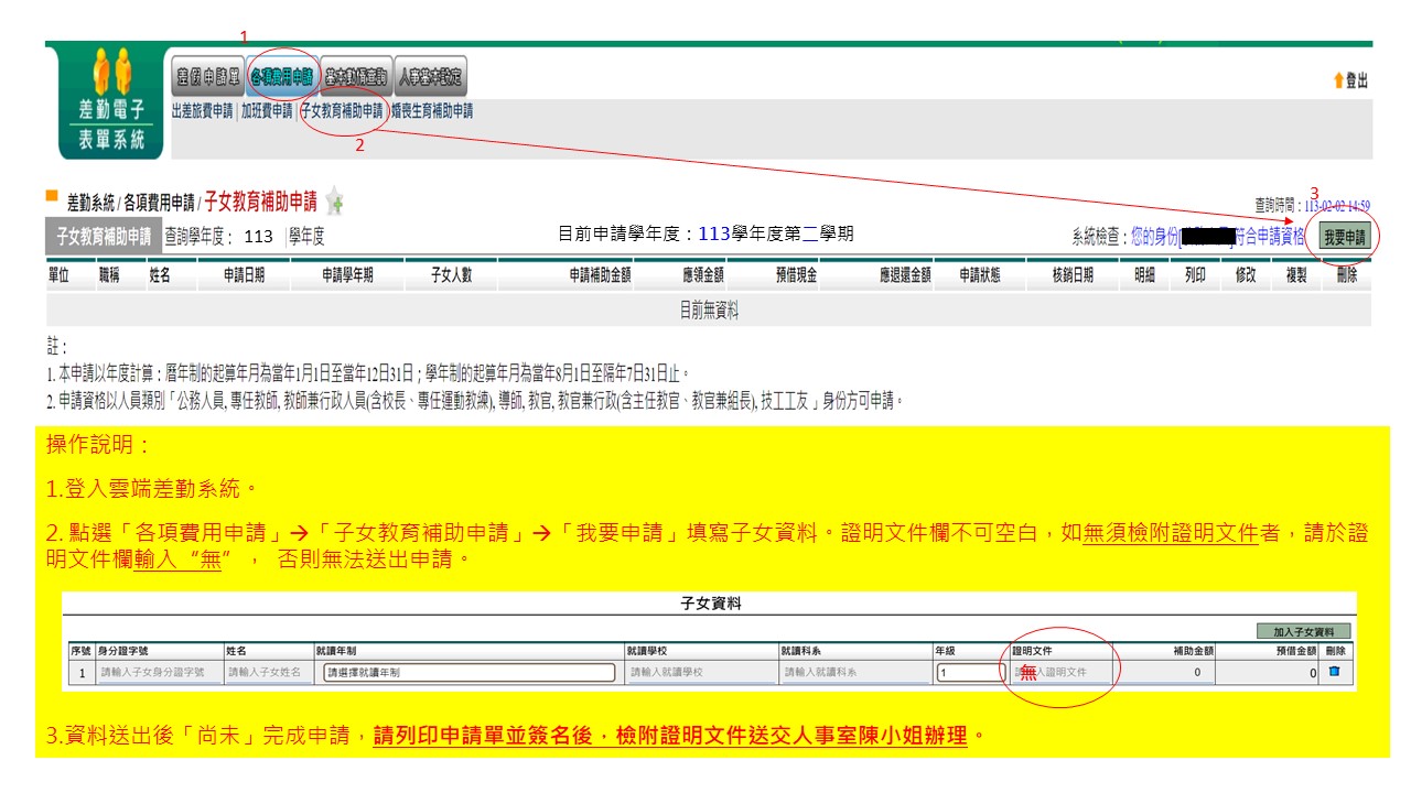 公告:114學年度第二學期子女教育補助費申請注意事項國立彰化師範大學附屬高級工業職業學校 人事室 公告 中華民國 115 年 1 月 30 日 主 旨:受理申請114學年度第2學期子女教育補助費。 公告事項: 一、申請期程:115年3月17日(星期二)前向本校人事室申請。 二、申請手續及繳驗證件: (一)申請表:於雲端差勤系統製表,以A4直式列印簽名後送人事室辦理。 (二)戶口名簿:向本校第一次申請者提供。 (三)繳費單據:國中、國小無須繳驗;公私立高中(職)以上繳驗收費單據,如係繳交影本應書明「與正本相符」並簽名。又未能繳驗收費單據者,得以其他足資證明繳付學費(支付)事實之證明文件,併附原繳費通知單申領。申請就學貸款者,請繳驗學校收款證明。 三、不得申請情形:子女有下列情形之一者,不得申請子女教育補助。但不包括領取優秀學生獎學金、清寒獎學金、民間團體獎學金及就讀國中小未因特殊身分獲有全免(減免)學雜費或政府提供獎助者: (一)全免或減免學雜費(含十二年國民基本教育學費補助)。 (二)屬未具學籍之學校或補習班學生。 (三)就讀公私立中等以上學校之選讀生。 (四)就讀無特定修業年限之學校。 (五)已獲有軍公教遺族就學費用優待條例享有公費、減免學雜費之優待。 (六)已領取其他政府提供之獎(補)助,如:教育部定額減免私立大專學生學雜費新臺幣3.5萬元/年、高中職全面免學費等措施。 四、夫妻同為公教人員者,其子女教育補助應自行協調由一方申領。 五、其他請參照附件「子女教育補助表」說明。 六、配合教育部實施「拉近公私立學校學雜費差距及其配套措施方案」(以下簡稱教育部補助款)事項: (一)基於政府學雜費補助不重複請領原則,學生若同時具有各類就學費用減免辦法或其他部會助學補助等方案之資格,得依當事人意願自行擇一擇優辦理學雜費補助。 (二)教育部補助款與子女教育補助無法重複請領,如申請人擇領子女教育補助,須將教育部已扣減之1.75萬元款項退回學校,並於申請時繳驗全額學費之收費單據於本校人事室。