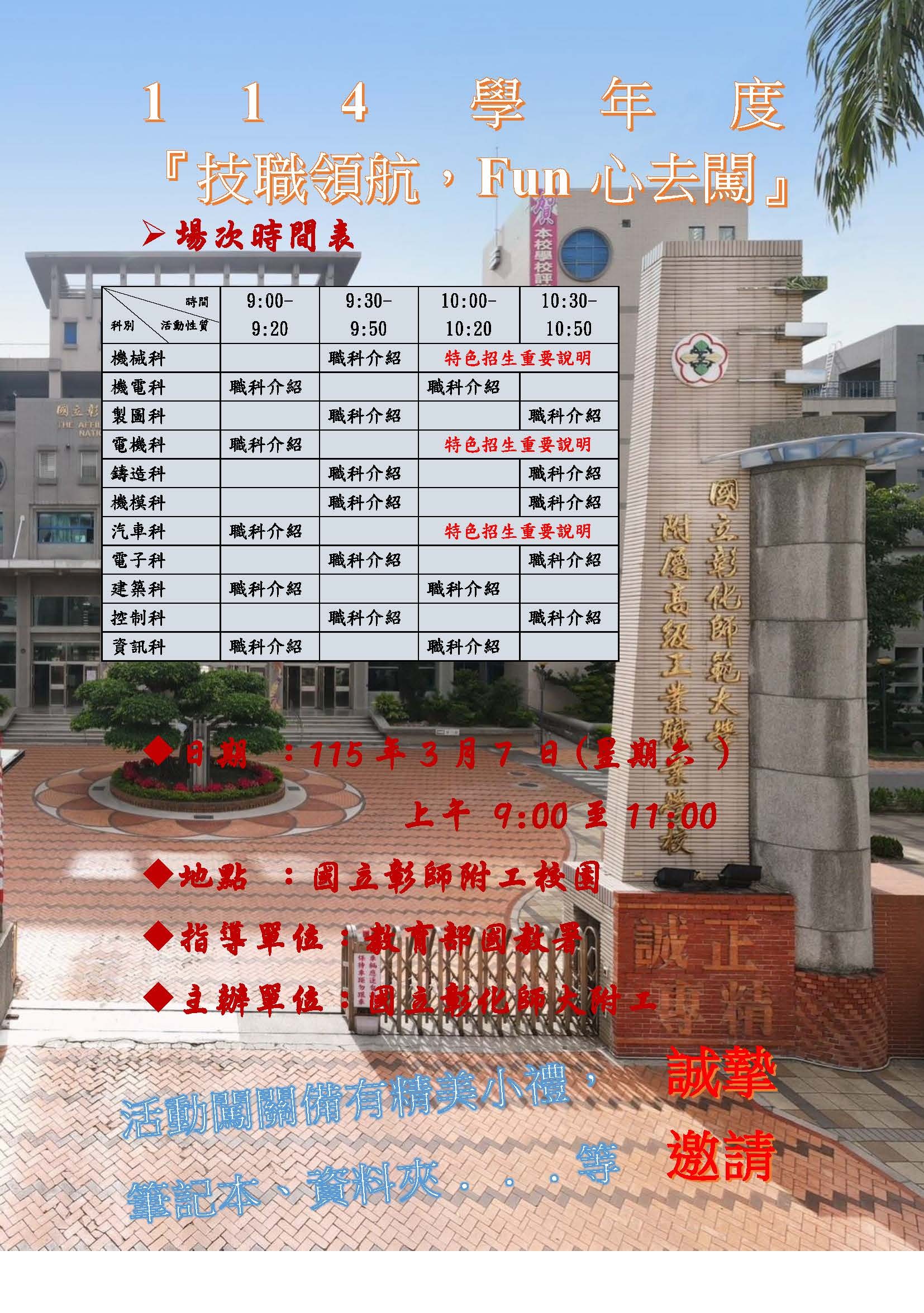 [公告]114學年度本校辦理『技職領航,Fun心去闖』歡迎國中學生及家長踴躍報名參加(職科說明會)
