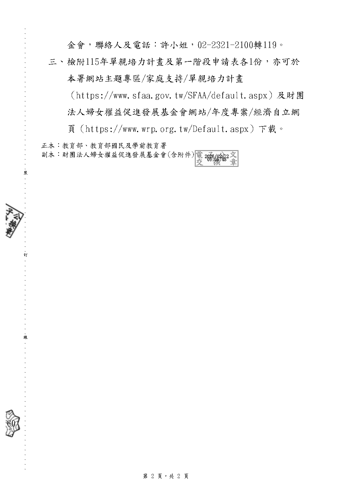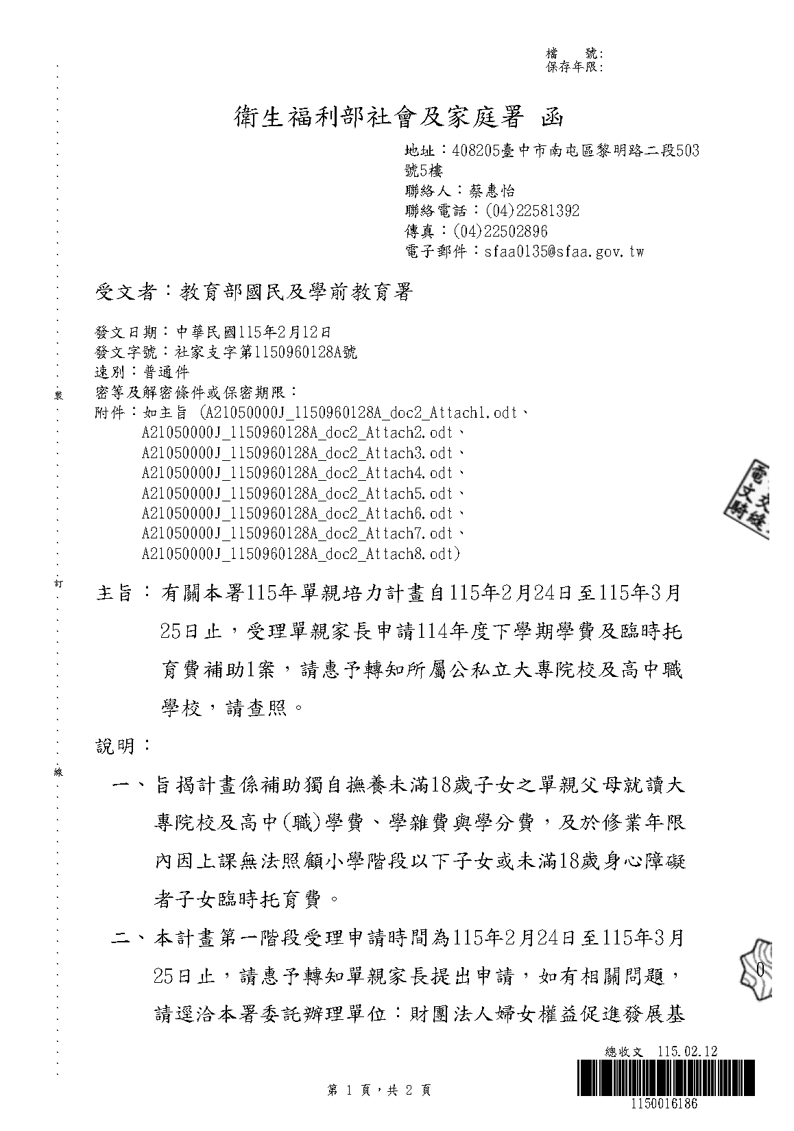 函轉衛生福利部社會及家庭署「115年單親培力計畫」,即日起至115年3月25日止