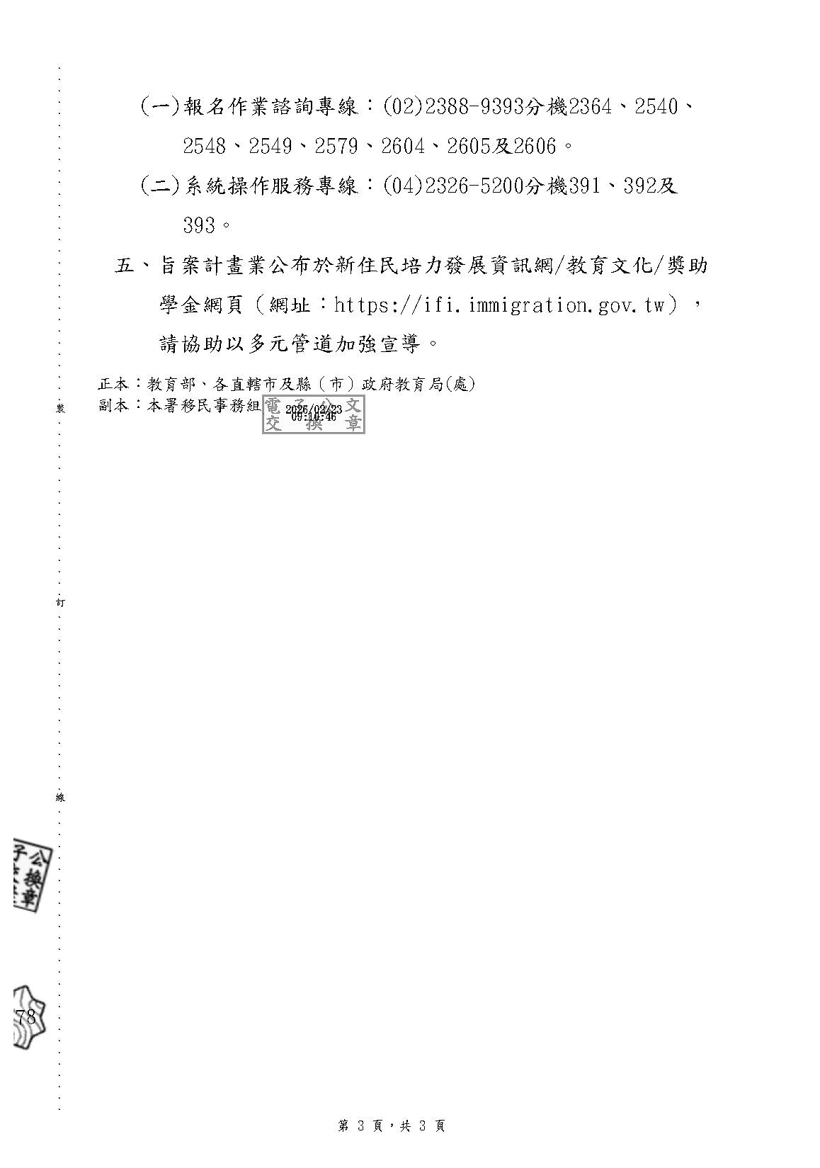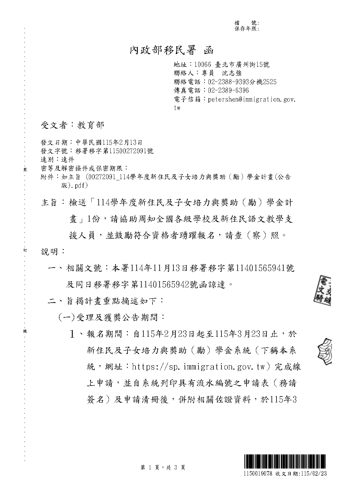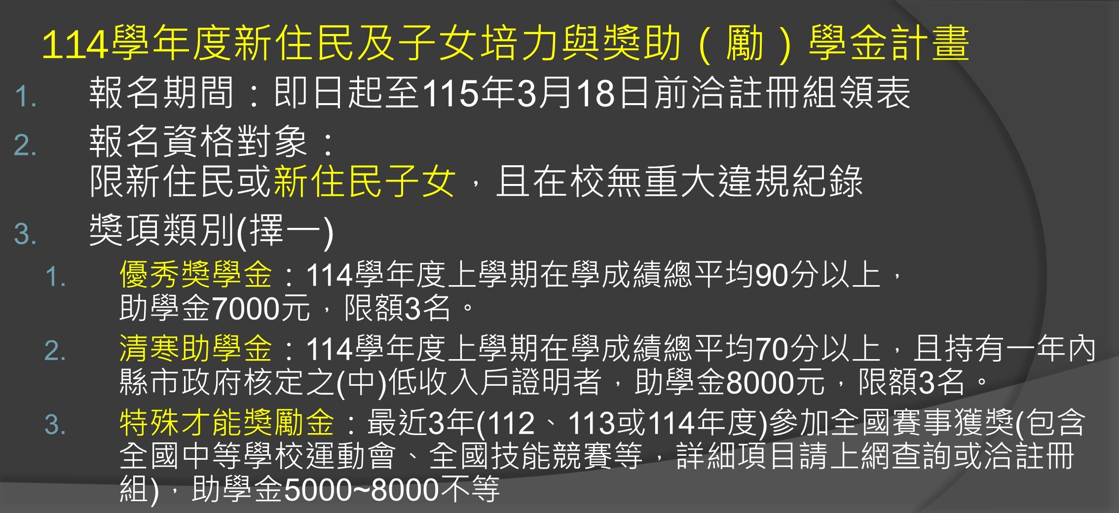 轉知「114學年度新住民及子女培力與獎助(勵)學金計畫」,即日起至3月20日截止,請洽註冊組