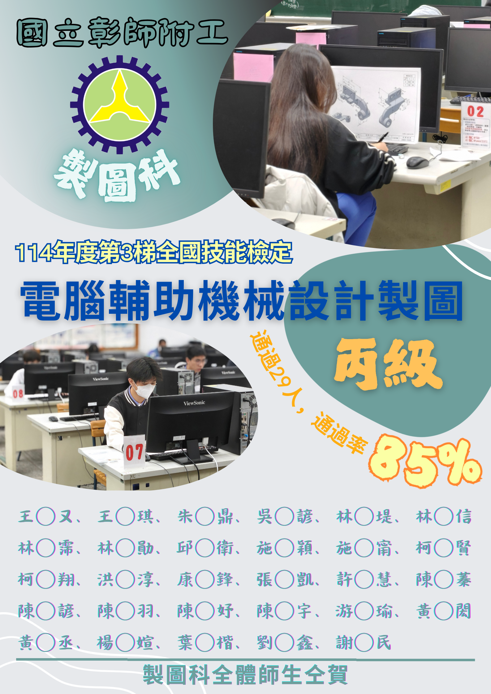 【檢定】本科學生參加114年度第三梯全國技能檢定「電腦輔助機械設計製圖 丙級」,通過率85%