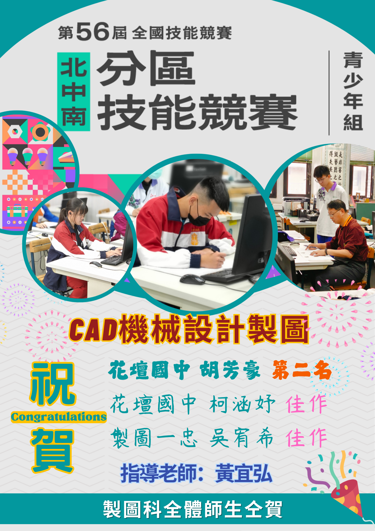 【恭賀】本科黃宜弘老師-指導學生參加第56屆全國技能競賽分區賽 青少年組「CAD機械設計製圖」職類,榮獲 1 銀、2位佳作~成績優異!