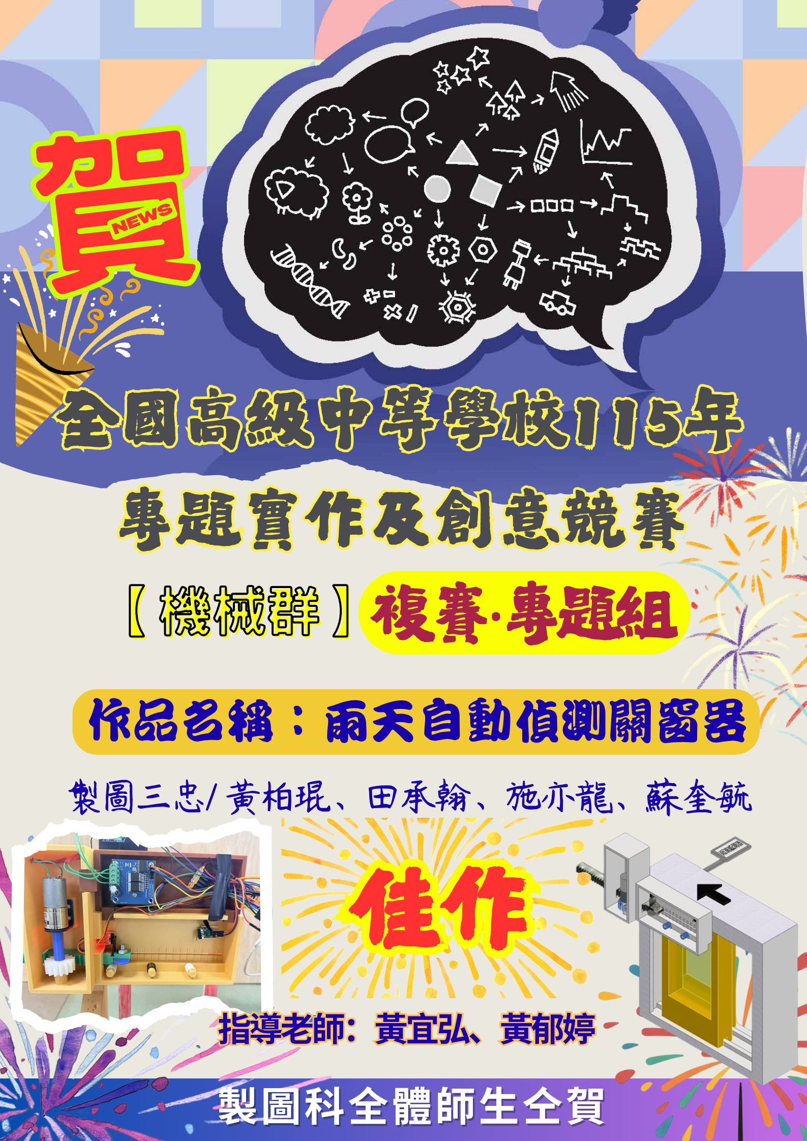 【恭賀】本科學生參加全國高級中等學校機械群115年度專題實作及創意競賽複賽,榮獲專題組「佳作」~表現優異!