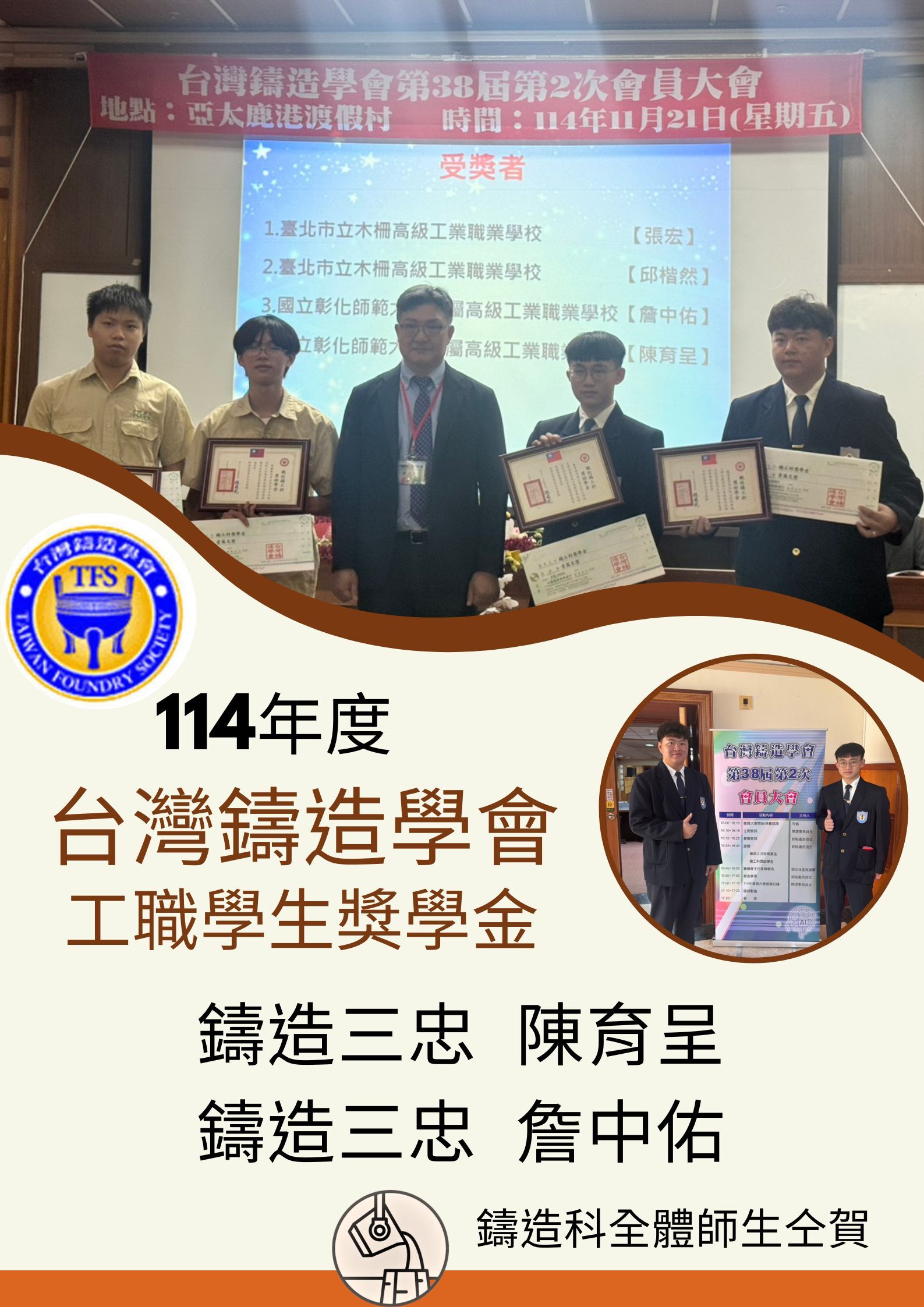 本科學生陳育呈、詹中佑榮獲台灣鑄造學會114年度獎學金