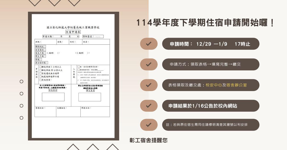 5、住宿申請結果將於115年1月16日17:00前將名單公布於校內網站,再請留意。