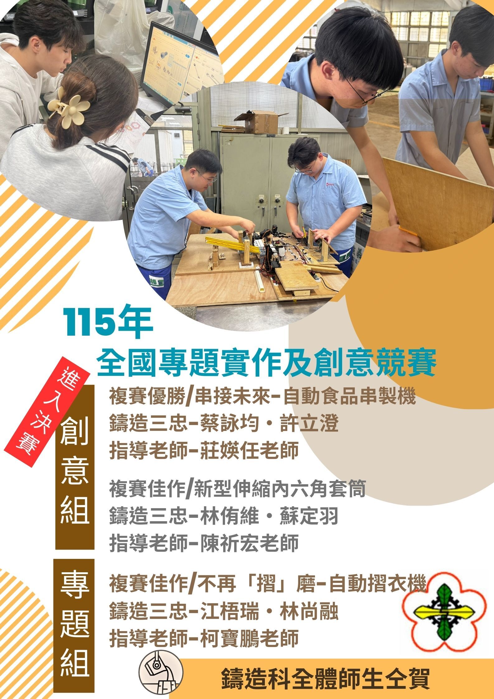 本科學生參加全國高級中等學校機械群115年度專題實作及創意競賽複賽表現優異!