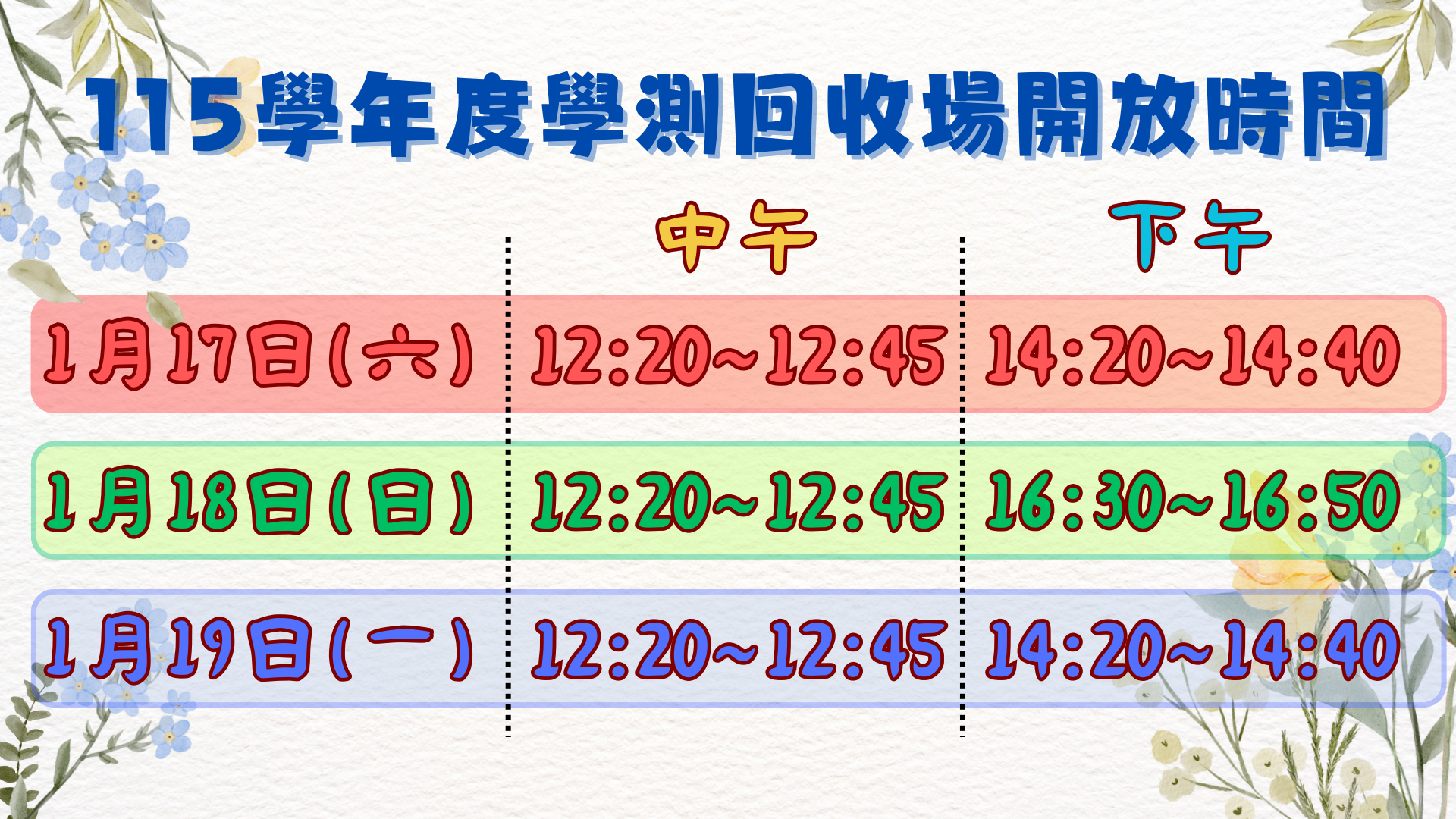 115學年度學科能力測驗 - 回收場開放時間及分類項目